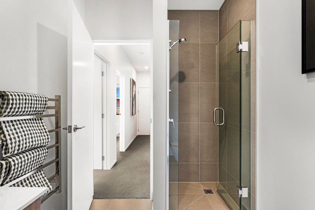 The upper floors provide excellent separation. Bedrooms are arranged to offer privacy and flexibility, while the top level captures wide views across St Heliers and works well as a master retreat or a dedicated home office. An ensuite complements this space, with an additional bathroom located on the mid floor for everyday convenience.