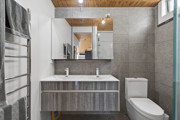 Inside, the home has a confident industrial edge. Polished concrete floors, exposed block walls and warm timber ceilings create a calm, considered interior, softened by natural light. Large windows draw light through the living space, while the balcony provides an easy extension for everyday use.