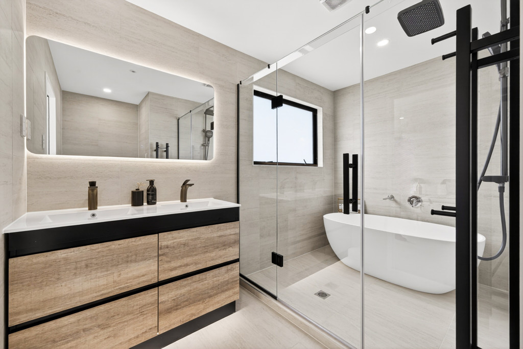Upstairs, the master suite is positioned to take in views across to Rangitoto and the Hauraki Gulf, complete with a walk-in wardrobe and a well-appointed en-suite with freestanding bath. Three additional bedrooms provide flexibility for families, guests, or working from home.